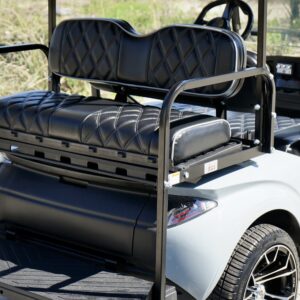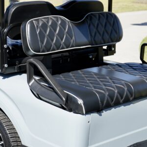 Black seats with white diamond stitching and white piping