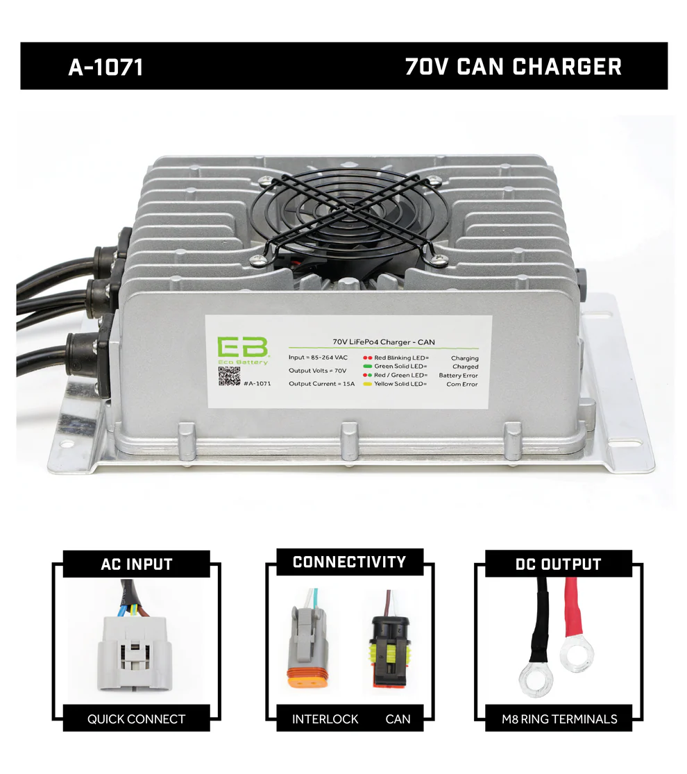 When upgrading to a new 70V Eco Battery, this charger is the ideal match. With a charge rate of 15 amps, it is specifically designed to deliver the power needed for your 70V lithium powerhouse.